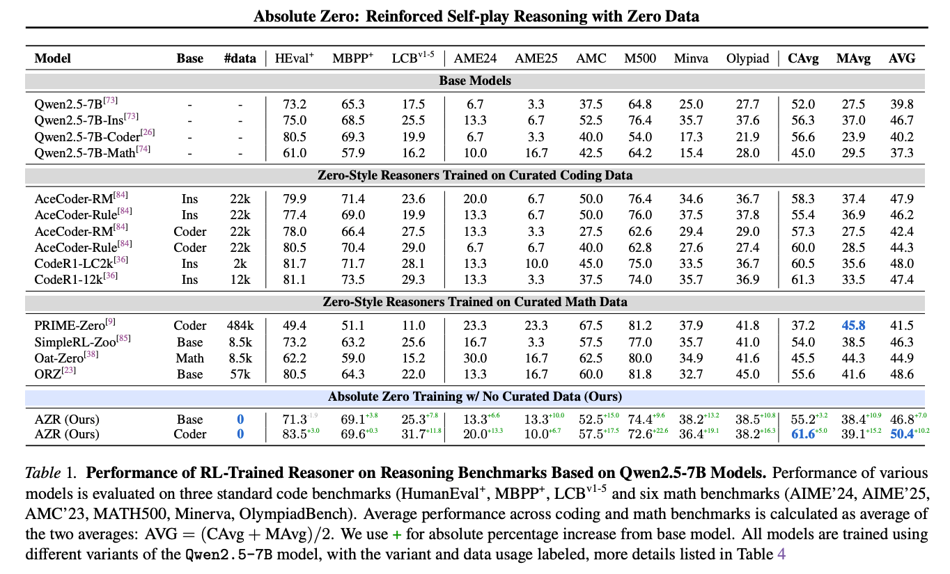 Key Performance Results: The paper reports that AZR achieves state-of-the-art (SOTA) performance across both coding and mathematical reasoning tasks. Notably, it outperforms existing "zero-setting" models that, while not using supervised reasoning traces, still rely on tens of thousands of human-curated problem-answer pairs for their training. Furthermore, AZR demonstrates strong cross-domain transfer of reasoning skills and shows that its performance improvements scale effectively with increasing model size.