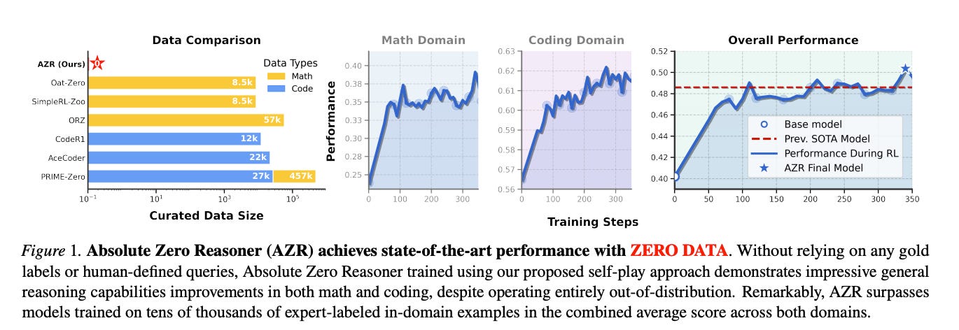 The proposed Absolute Zero Reasoner (AZR) embodies this paradigm. AZR features a single model that learns to propose tasks maximizing its own learning progress and improves its reasoning by solving these self-generated tasks. A code executor serves as a unified environment to both validate the proposed code reasoning tasks and verify the model's answers, providing a verifiable reward signal for open-ended yet grounded learning. Remarkably, despite being trained entirely without external data, AZR is reported to achieve overall state-of-the-art (SOTA) performance on coding and mathematical reasoning benchmarks, surpassing existing "zero-setting" models that utilize tens of thousands of in-domain human-curated examples. The authors also demonstrate AZR's effective applicability across different model scales and its compatibility with various model classes.