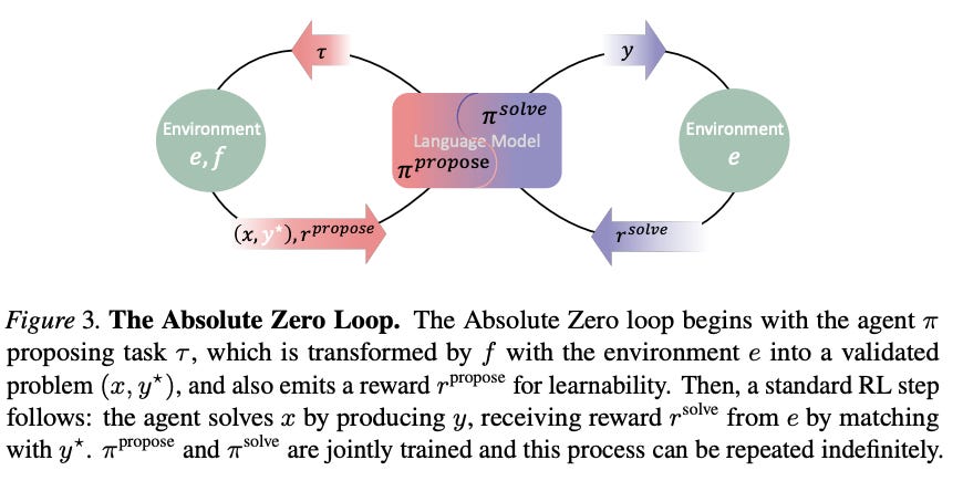 2.2. Absolute Zero: The core tenet of Absolute Zero is the elimination of this external data dependency. The paradigm facilitates a self-play mechanism wherein the model itself assumes the dual roles of task proposer and task solver. The proposer samples a task, which is then validated by an external environment (e.g., a code executor), thereby creating a verifiable reasoning task. The solver component of the model then generates a solution. Through this continuous cycle of proposal, validation, solution, and verification, the proposer and solver are jointly trained, enabling indefinite and autonomous learning.