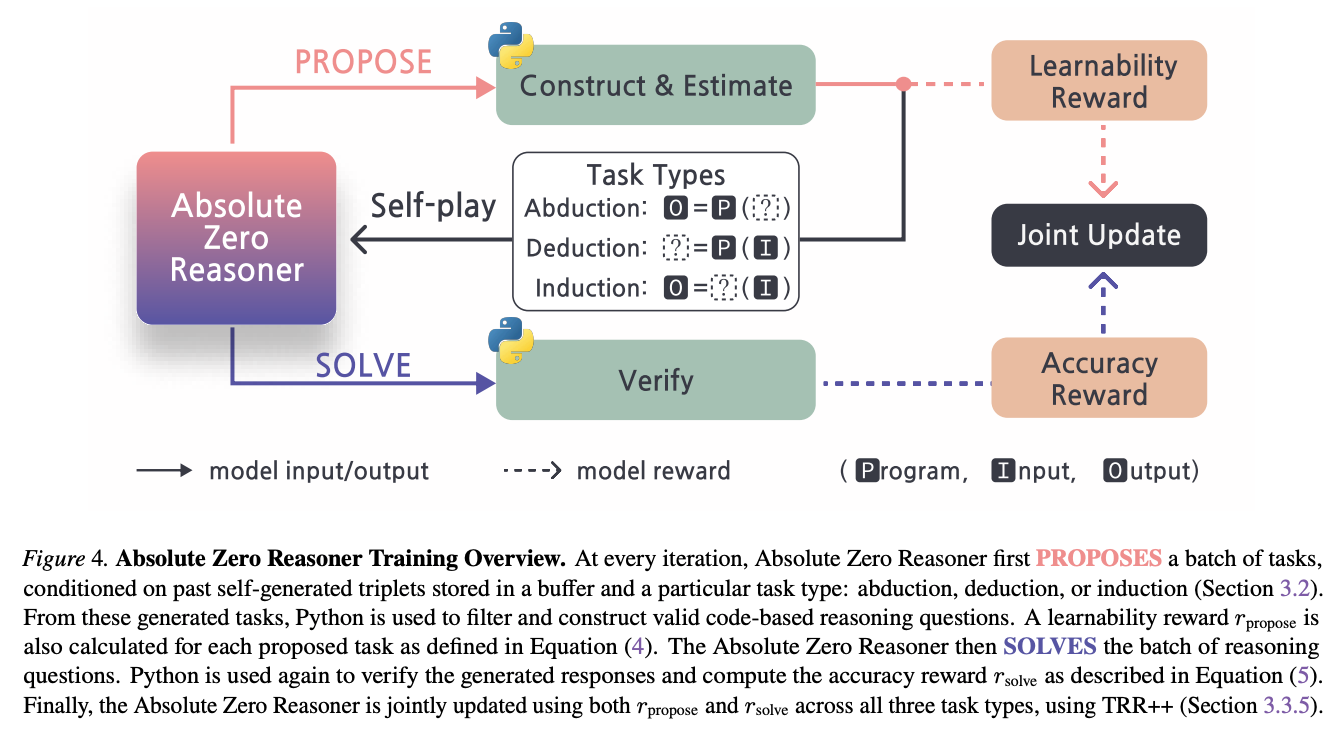 Model Update: This reward is used to update the parameters of the single underlying language model using reinforcement learning algorithms. This update refines the model's abilities in both proposing appropriately challenging and solvable tasks and in effectively solving them. This cycle repeats continuously, enabling AZR to progressively enhance its reasoning capabilities and adapt its internal training curriculum without recourse to any external datasets or human intervention.
