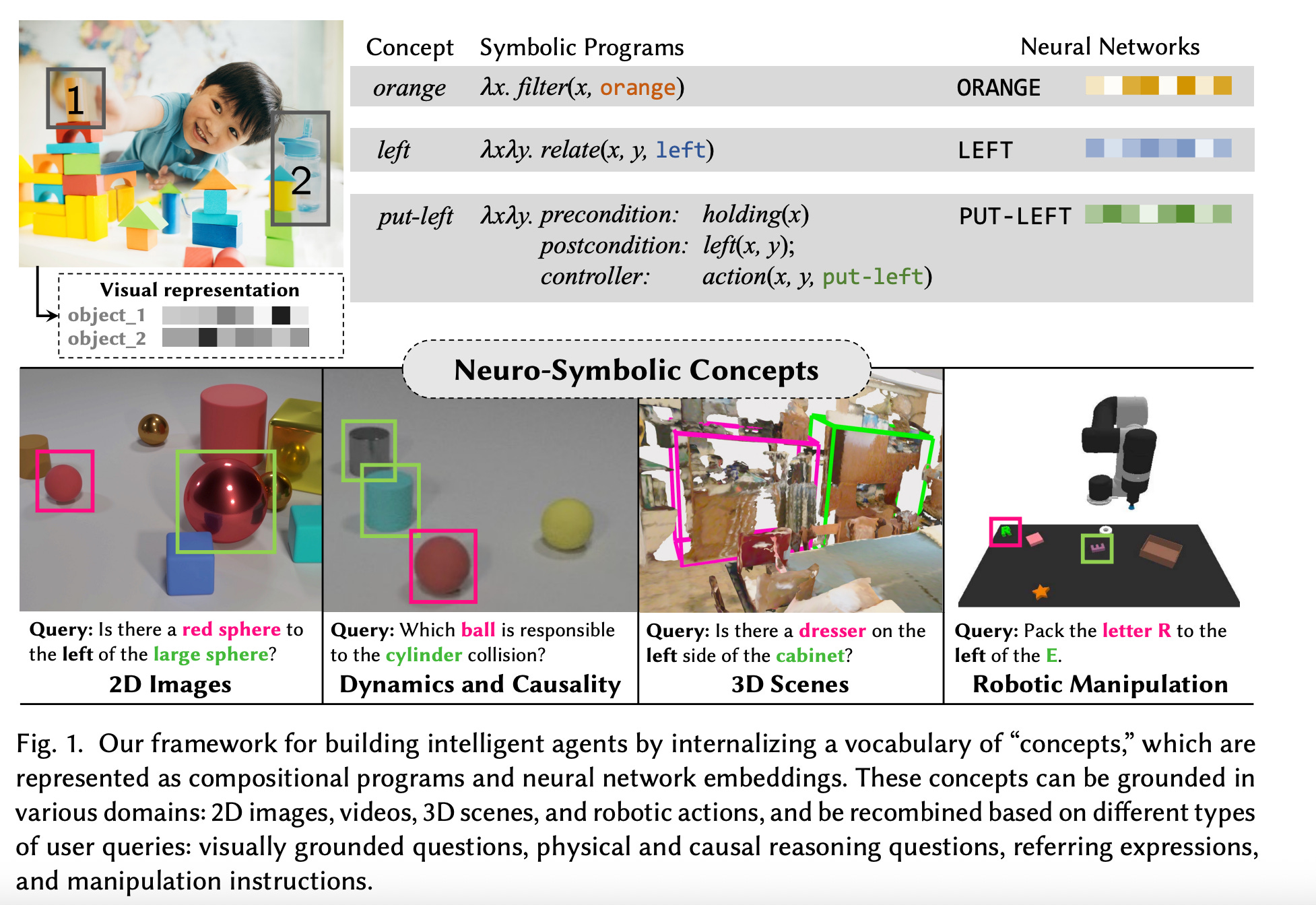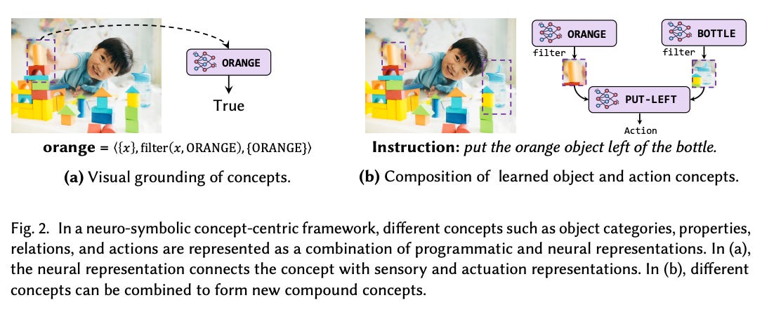 The paper introduces a concept-centric architecture for intelligent agents designed for continual learning and flexible reasoning. Central to this architecture is a vocabulary of "neuro-symbolic concepts"—constructs such as objects, relations, and actions—that are grounded in sensory inputs and actuation outputs. A key characteristic of these concepts is their compositional nature, enabling the generation of novel conceptual structures through systematic combination. The authors elucidate that these concepts are typed and represented via a hybrid approach, integrating symbolic programs with neural network representations to facilitate robust learning and reasoning. The framework's utility is demonstrated across diverse domains, including 2D image and video analysis, 3D scene interpretation, and robotic manipulation tasks, underscoring its potential for efficient learning and recombination of conceptual knowledge.