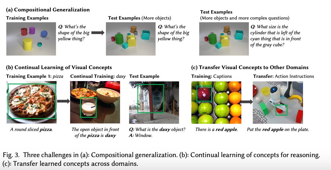 Compositional Generalization: Extending learned knowledge to novel combinations of known primitives at both concept and scene levels.
